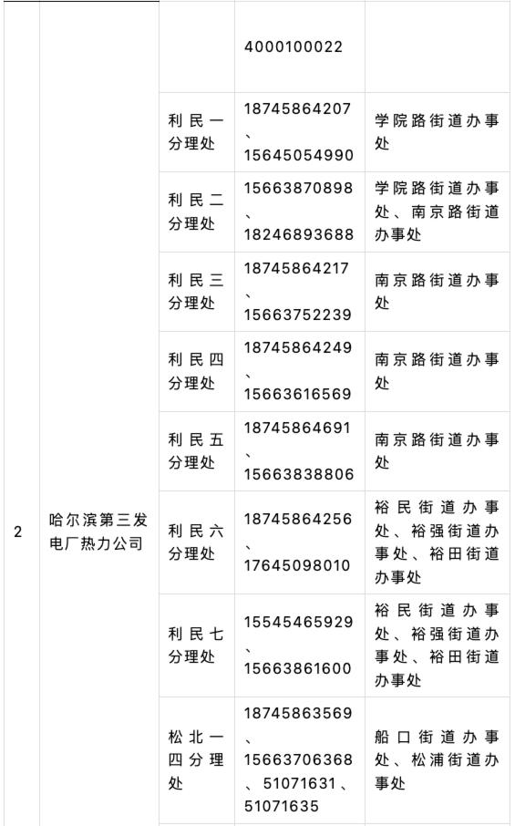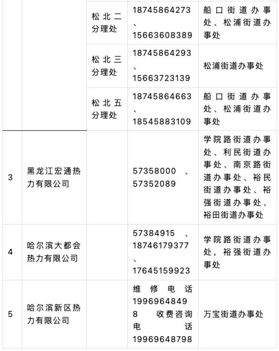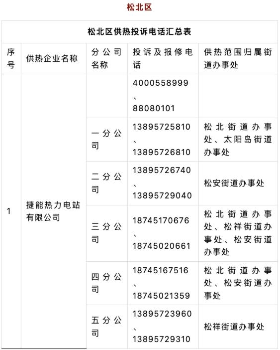 松北区供热投诉电话汇总表序号供热主管部门名称投诉及报修电话1松北街道办事处881000362松浦街道办事处840923743船口街道办事处867741784太阳岛街道办事处840105035松祥街道办事处586276746松安街道办事处586275657利民街道办事处573690208利业街道办事处573514309南京路街道办事处5735358810学院路街道办事处5683272711裕强街道办事处5689206912裕田街道办事处5686589013裕民街道办事处8713809014松北区供热办88080677