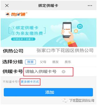 1、先选择分组后,再输入供暖卡号点击添加;若忘记卡号可点击更多绑卡方式。