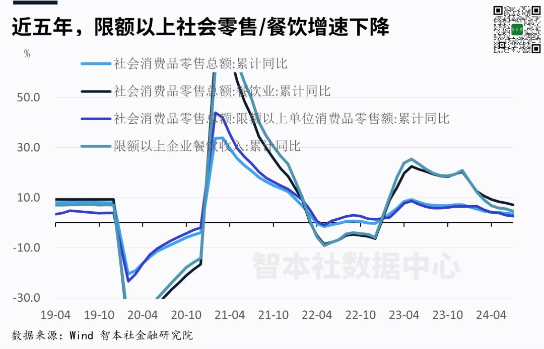 最近几年受疫情冲击,家庭资产负债表出现疤痕难以修复,加上38万亿房贷负担、提振需求措施力度不足,居民收入和消费预期转弱,消费在疫后复苏又迅速回落,单月社会零售尚未顺利突破4万亿元,消费尚未恢复到疫情之前的潜在增速水平。