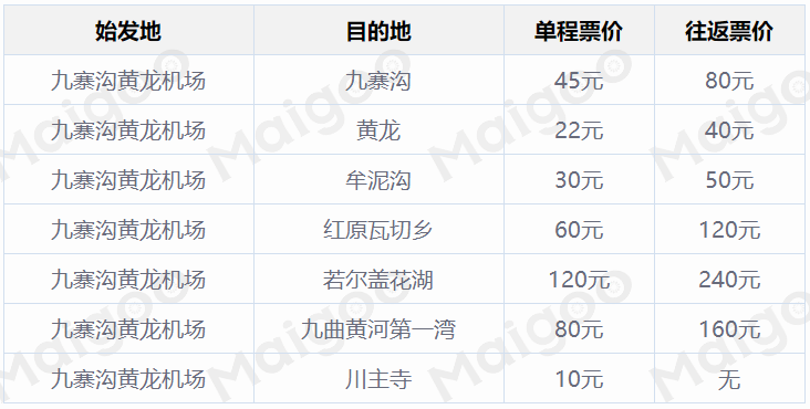 在乘飞机到达九黄机场后,还要转乘客车才能到达九寨沟景区。同时在九黄机场亦可乘车直达黄龙、牟尼沟、红原瓦切乡、若尔盖花湖、九曲黄河第一湾以及川主寺等地,详情如下(仅供参考,请以官方发布为准):