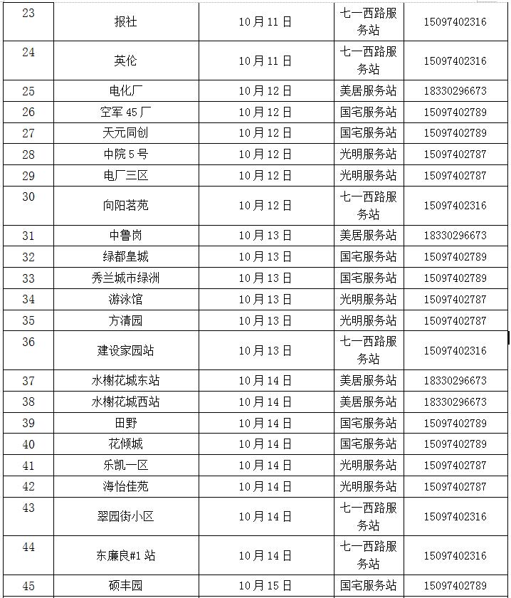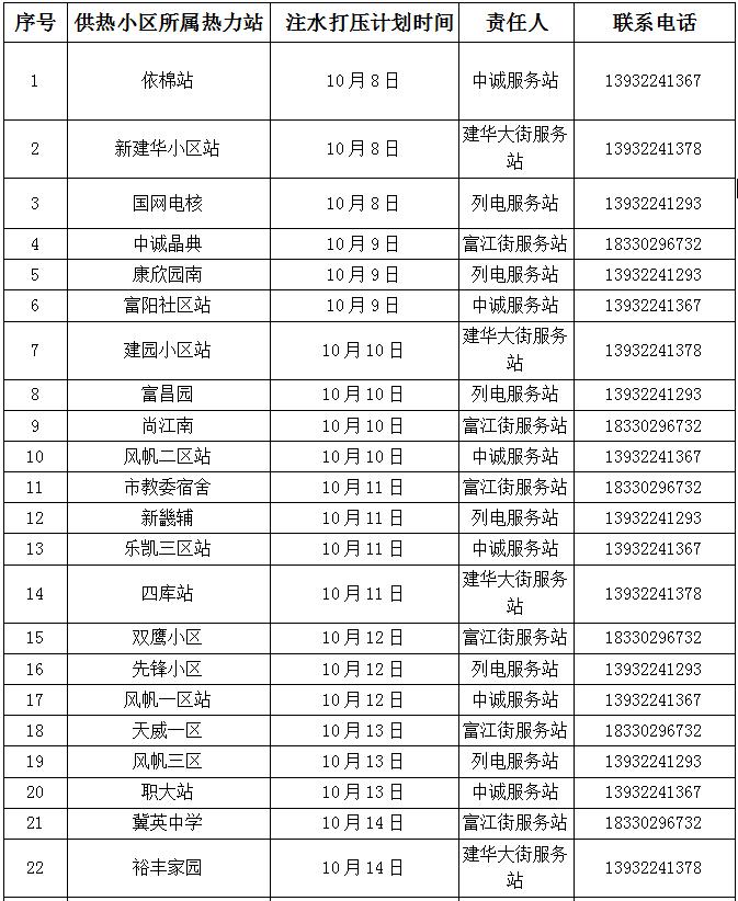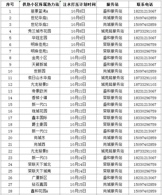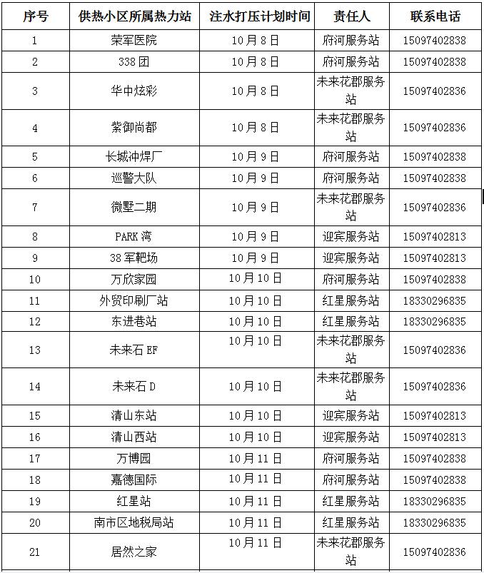 以上计划表仅作为部分小区注水试压时间说明,具体时间以纸质通知单为准,请热用户及时关注小区单元门口或告示牌张贴的注水试压通知。
