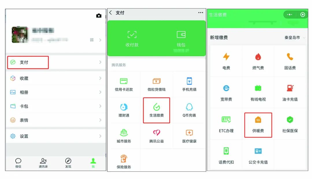 微信支付—【生活缴费】—【定位城市为“秦皇岛”】—【供暖费】—选择【秦皇岛市富阳热力有限责任公司】即可。