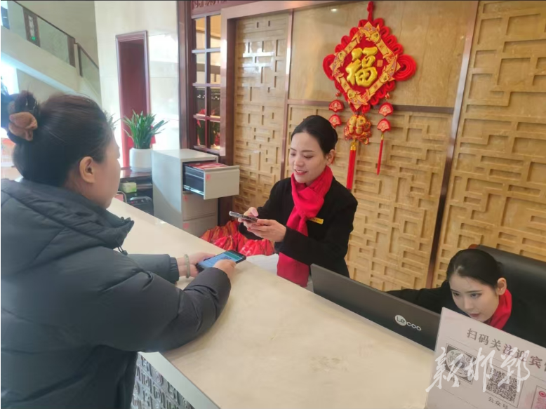 邯郸市丛台迎宾馆中,一名女士在核销活动券办理免费入住。