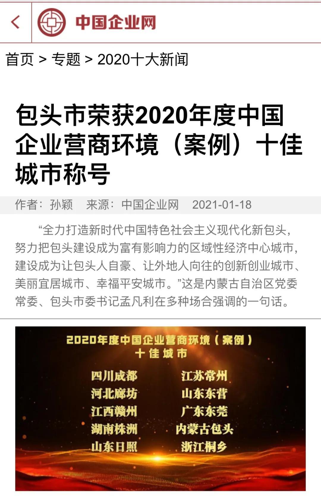 1月17日,第十八届中国企业发展论坛第八次中国企业营商环境峰会暨2020年度中国企业十大新闻发布仪式在北京举行,包头以优异“成绩单”,荣获“2020年度中国企业营商环境(案例)十佳城市”称号。