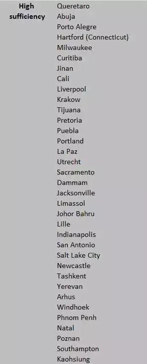 GaWC将世界城市分为四个大的等级:Alpha(一线城市)、Beta(二线城市)、Gamma(三线城市)、Sufficiency(自给自足城市,也可理解为四线城市)。