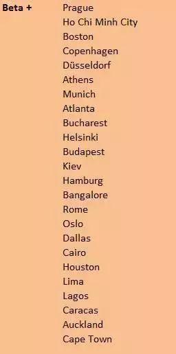 悉尼、圣保罗、米兰、芝加哥、墨西哥城、孟买、莫斯科、法兰克福、马德里、华沙、约翰内斯堡、多伦多、首尔、伊斯坦布尔、吉隆坡、雅加达、阿姆斯特丹、布鲁塞尔、洛杉矶。