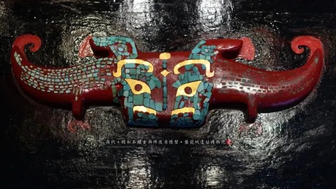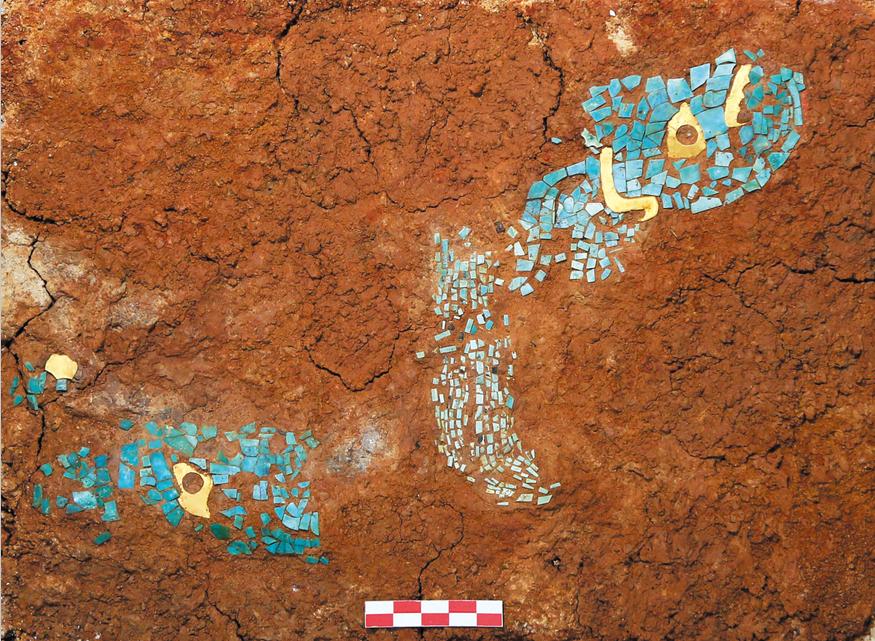 整个饰件原本附着在有机物质上,图案是对称展开的兽面。后来,由于埋藏时间太长,有机物腐朽了,上面的兽面纹也因此散落成两组。绿松石与金的组合,暗示着墓主具有很高的社会地位。