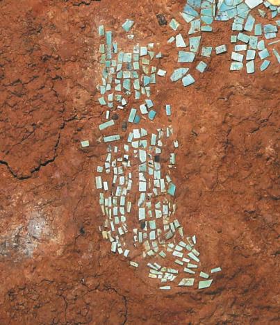 兽面的眉毛、眼睛、牙齿等部位用金片装饰,在绿松石的衬托下,视觉效果十分突出。北侧一组兽面同样由金片和绿松石片组成,排列为菱形,应为兽面鼻梁的部分。