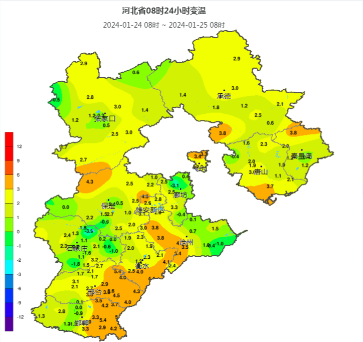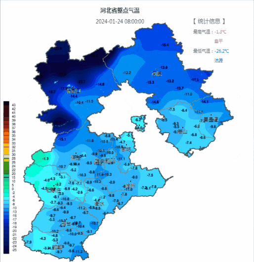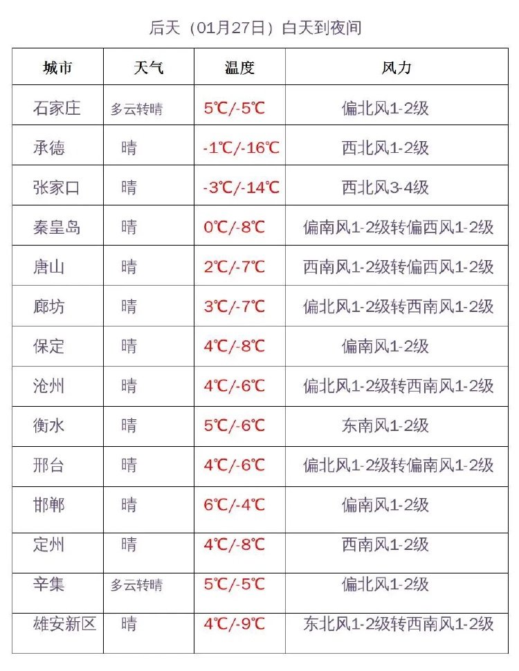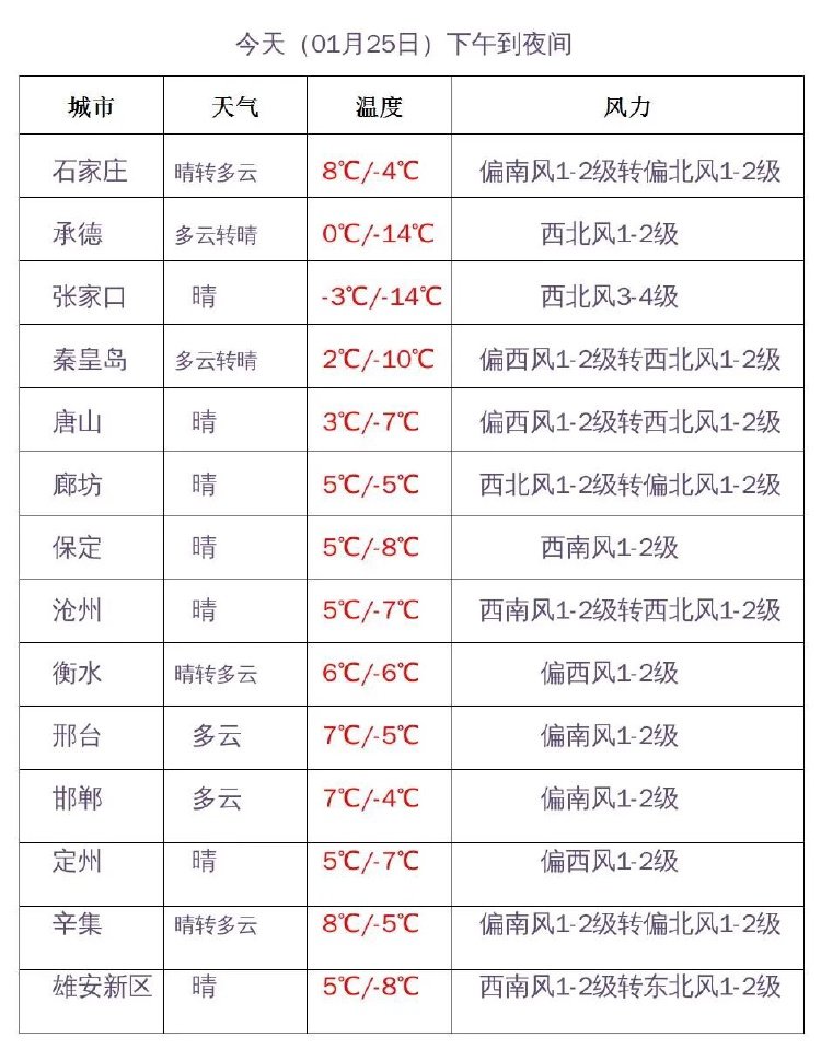 今天下午到夜间,保定、廊坊以北地区多云转晴,石家庄、沧州以南地区晴转多云,其他地区晴间多云。最高气温,张家口、承德、保定西北部、秦皇岛东部-10~1℃,其他地区2~7℃。最低气温,张家口、承德、保定西北部、秦皇岛北部-25~-11℃,其他地区-10~-2℃。