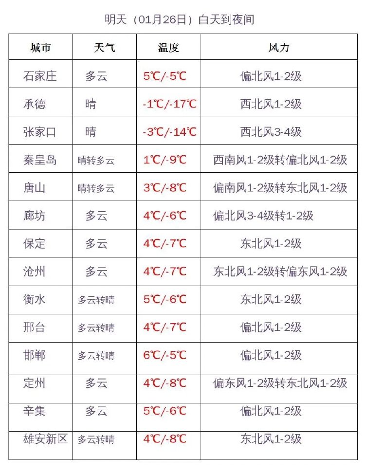 明天夜间到27日,保定、廊坊及以南地区多云转晴,其他地区晴间多云。