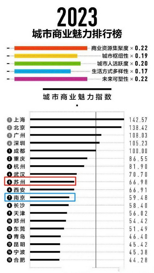 为保证榜单的延续性与可比性,2023年城市商业魅力排行榜沿用了上一年的商业资源集聚度、城市枢纽性、城市人活跃度、生活方式多样性和未来可塑性五大指标,并维持了原有的算法框架:一级指数的权重以新一线城市研究所专家委员会打分的方式计入,二级指数以下的数据则采用主成分分析法。