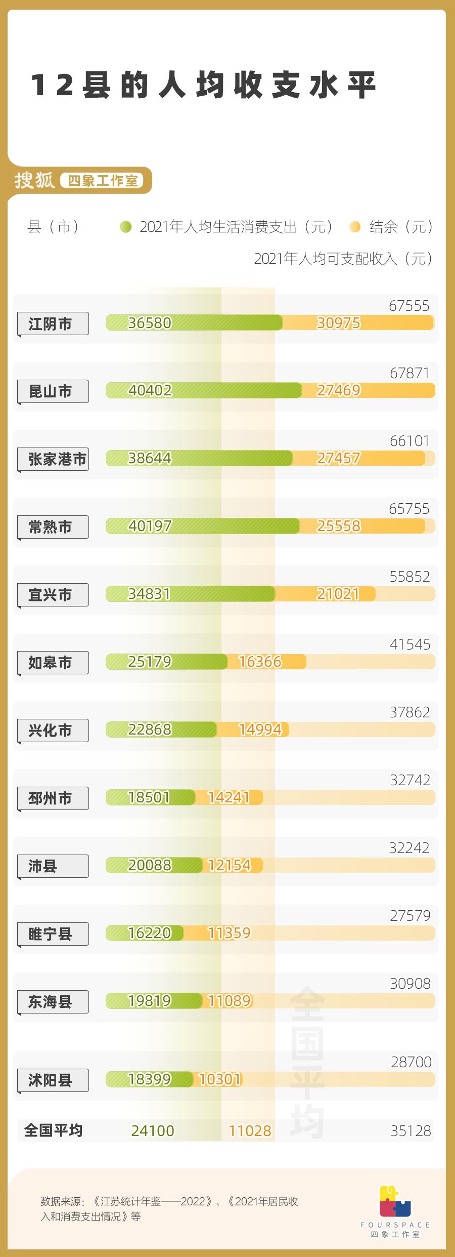 经济发展不光带来了好看的GDP数字,当地人的平均收入也甚为可观。昆山、江阴、张家港和常熟在2021年的人均可支配收入都超过了6万元,同年全国均值仅为3.5万元,消费支出虽也相对更高,一年还是能比全国平均多存下1~2倍的钱。
