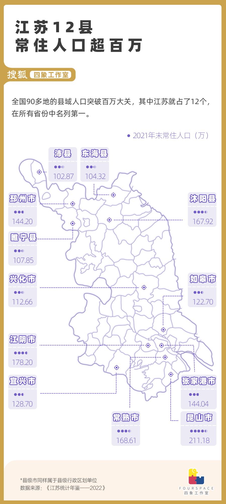 截至2021年底,江苏省共有19个县和21个县级市,其中常住人口超过100万的就有12个,超过了河南、山东、四川等人口大省。