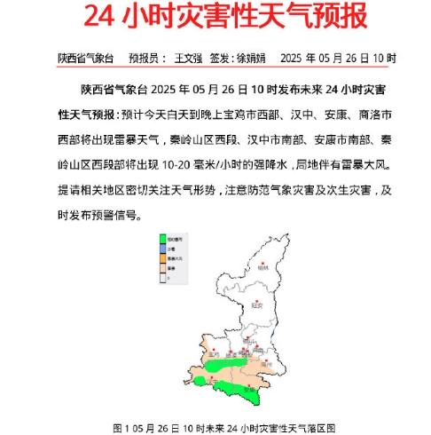 预计今天白天到晚上宝鸡市西部、汉中、安康、商洛市西部将出现雷暴天气,秦岭山区西段、汉中市南部、安康市南部、秦岭山区西段部将出现10-20毫米/小时的强降水,局地伴有雷暴大风。提请相关地区密切关注天气形势,注意防范气象灾害及次生灾害,及时发布预警信号。
