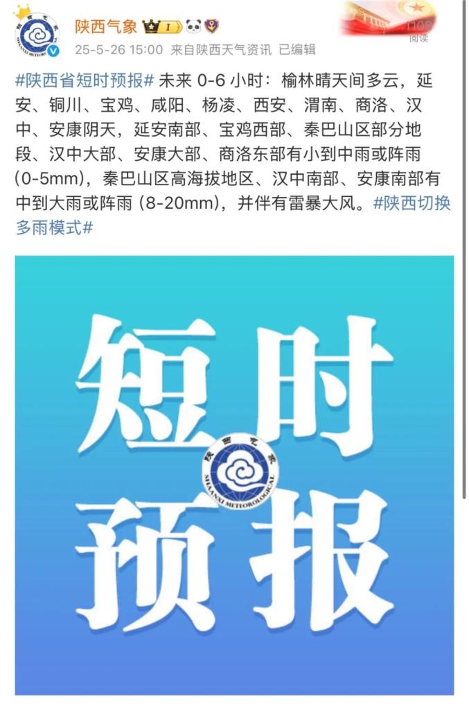 未来 0-6 小时:榆林晴天间多云,延安、铜川、宝鸡、咸阳、杨凌、西安、渭南、商洛、汉中、安康阴天,延安南部、宝鸡西部、秦巴山区部分地段、汉中大部、安康大部、商洛东部有小到中雨或阵雨(0-5mm),秦巴山区高海拔地区、汉中南部、安康南部有中到大雨或阵雨(8-20mm),并伴有雷暴大风