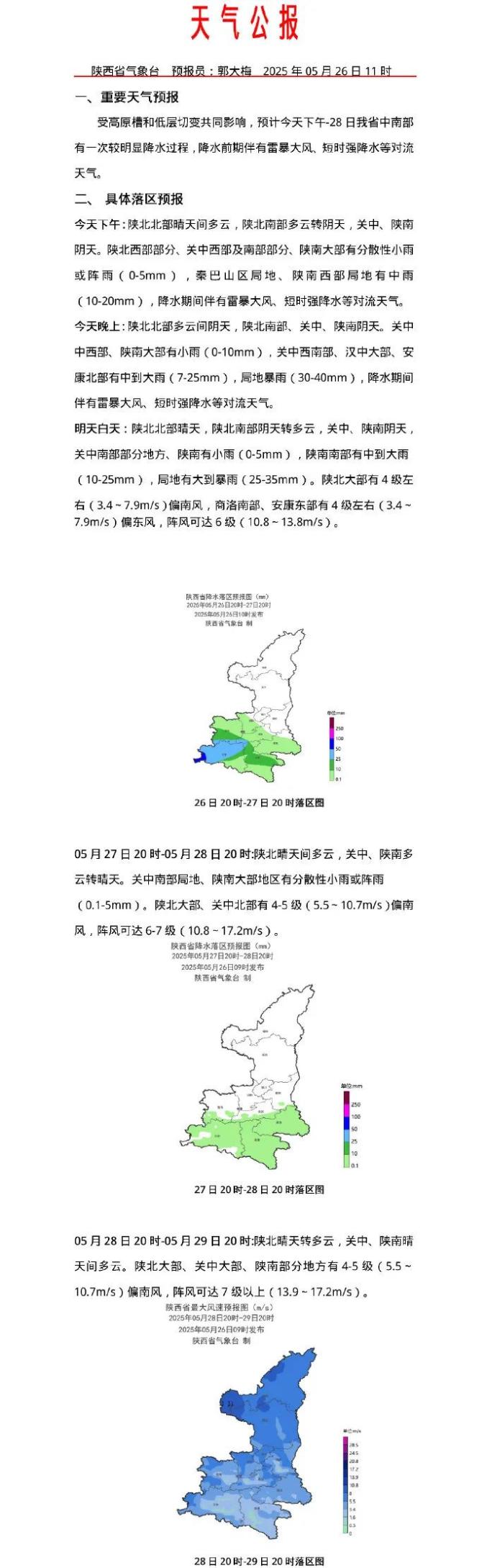 受高原槽和低层切变共同影响,预计今天下午-28日陕西省中南部有一次较明显降水过程,降水前期伴有雷暴大风、短时强降水等对流天气。