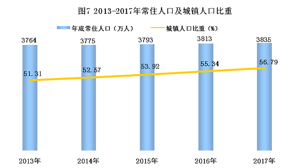 2017年末,全省常住人口3835.44万人,比上年增加22.82万人。其中,男性1979.85万人,占51.62%;女性1855.59万人,占48.38%,性别比为106.70。出生人口42.48万人,出生率11.11‰;死亡人口23.86万人,死亡率6.24‰;自然增长率4.87‰。城镇人口2178.15万人,占56.79%;乡村人口1657.29万人,占43.21%。人口年龄构成为0-14岁人口占14.34%,15-64岁人口占74.86%,65岁及以上人口占10.80%。
