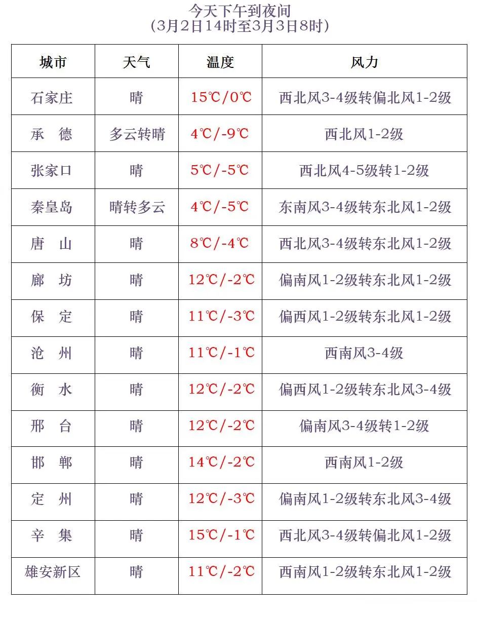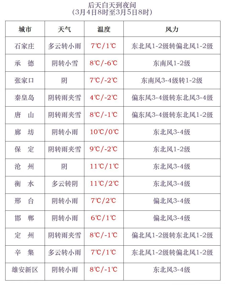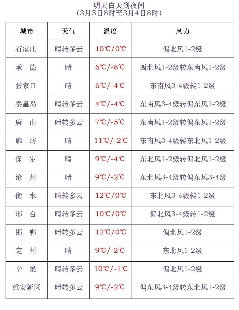 明天夜间到4日,全省晴转阴,其中邢台西部、邯郸西部有零星小雨或雨夹雪。