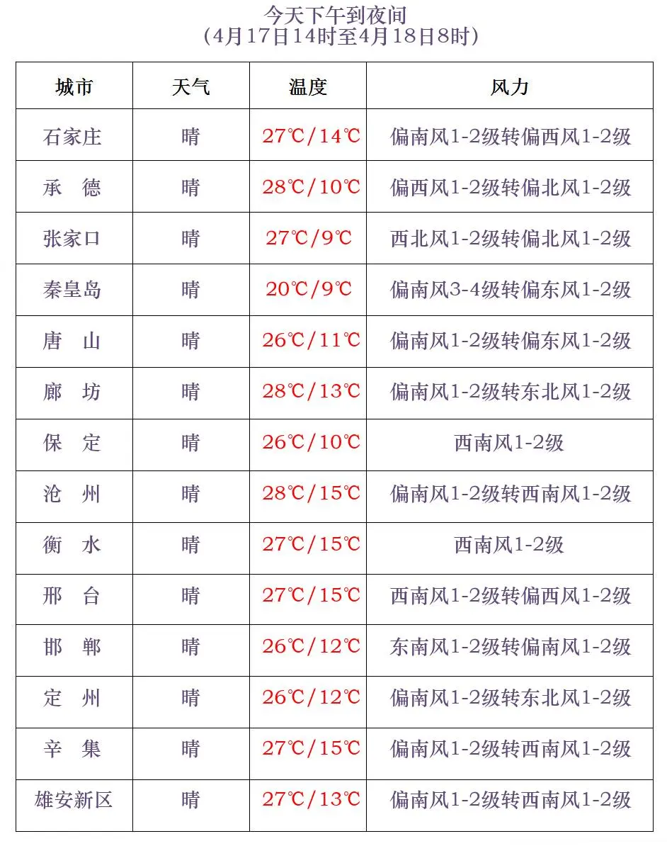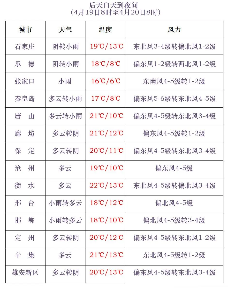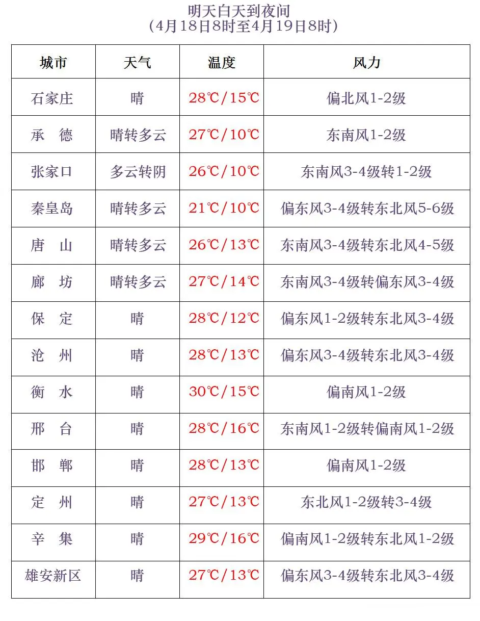 明天夜间到19日,张家口、承德北部、保定西北部多云转阴有分散性阵雨或雷阵雨,石家庄西部、邢台、邯郸多云转阴有小雨或零星小雨,其他地区晴转多云。18日后半夜到19日夜间,渤海海域和沿海地区有东北风5到6级,阵风7到8级。