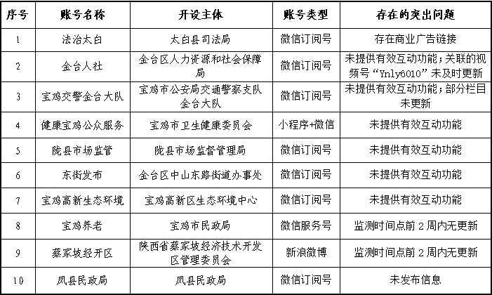 (一)个别县区和部门未严格落实政务新媒体监管责任。宝鸡市文化和旅游局(市广播电视局)“宝鸡文旅”、宝鸡市公安局凤翔分局“凤翔公安”、扶风县司法局“法治扶风”、扶风县天度镇人民政府“金果天度”、凤县市场监督管理局“凤县市场监管”、凤县公安局“凤县公安”、太白县文化和旅游局“陕西省太白县旅游”视频号等政务新媒体账号未纳入监管。