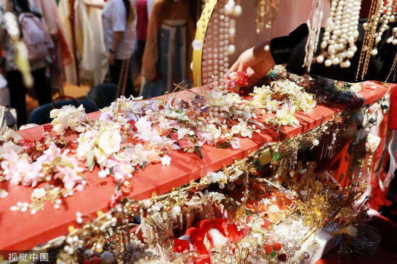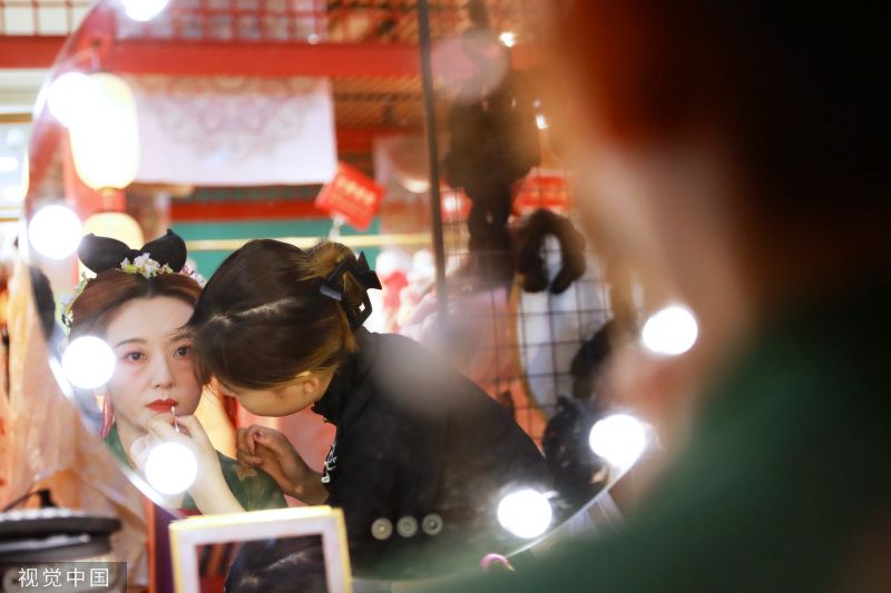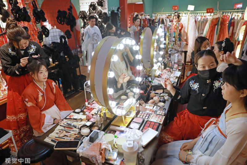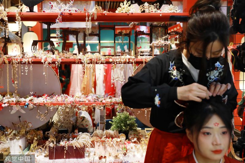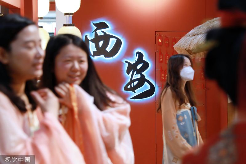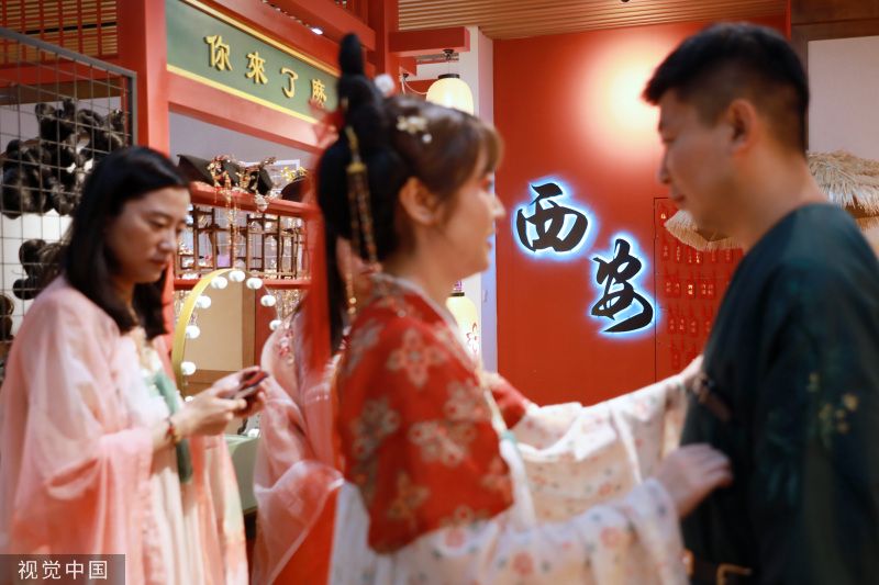 2023年5月22日,西安大唐不夜城步行街区,身着汉服的游客在街区游玩。首届中国-中亚峰会上周成功举行,让西安这座千年古都绽放出新时代的荣耀风采。从“大唐盛礼”恭迎贵客到首次半开放式集体国宴,无处不在的盛唐元素与魅力。 衣裙轻舞,环佩叮当,5月22日上午,身穿汉服的两位江苏游客在大唐不夜城步行街打卡拍照,并不时感慨道:“西安和唐装汉服的适配度太高了!” 2023年“五一”假期,西安旅游人气高涨,共接待游客1330.51万人次,实现旅游收入107.46亿元。西安也多次出现在假期十大旅游热门目的地榜单。在厚重的历史文化氛围滋养下,身着唐装汉服畅游古都正在成为西安一道亮丽的风景线。 近年来,“沉浸式旅游”逐渐成为旅游新风尚。其中,“汉服体验”是最热门的游玩方式之一。西安大唐不夜城的工作人员介绍,随着文旅市场的强势复苏,2023年以来街区体验唐装汉服的游客明显增多,地处西安大唐不夜城中段的壹洋堂购物中心 ,商场里近七成的商铺打造成了汉服体验馆,从汉服租赁、妆造服务到汉服跟拍,这条产业链上的每个人密切合作,帮现代人进入盛唐时光。 遇见霓裳汉服体验馆的店主周薇又将迎来繁忙的工作。她的汉服体验馆就位于大唐不夜城。“从春节开始,‘汉服体验’的热度就一直在持续。西安丰富的历史文化资源为游客提供了浓重的‘穿越’氛围,当代年轻人对传统文化的喜爱也在持续升温。”周薇说。 对以汉服为代表的传统文化的喜爱持续升温,为文旅行业不断注入新动能,也促进相关从业者实现转型:周薇辞去了传统化妆行业的工作,从2019年开始着手汉服妆造到2022年提供成熟服务;从事自由职业的吴荣也将传统摄影业务拓展为汉服跟拍……一条“汉服体验”的旅游新业态在古都西安历史文化的滋养下正逐渐完善。 如今走在西安街头,大唐不夜城、大唐芙蓉园、长安十二时辰、城墙,甚至在地铁上,看到身着汉服的俊男靓女都不足为奇。“簪发持扇着汉服”成为越来越多年轻人的选择,一名或一群身穿汉服的男男女女,踏着优雅、细碎的步伐路过时,一种穿越历史之感油然而生。衣袂飘飘的华服,与古色古香的建筑相得益彰,“穿华服,游西安”成为时下潮流。