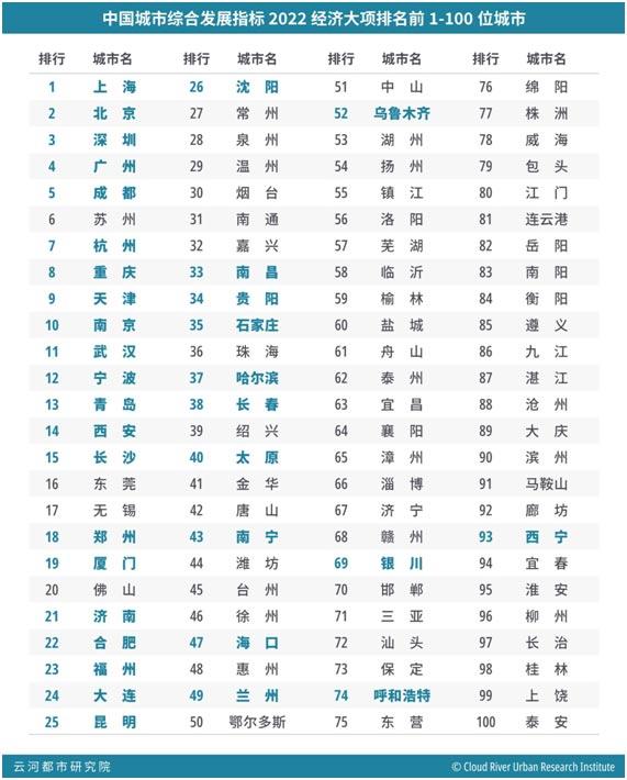 “中国城市综合发展指标2022”(以下简称“指标2022”)经济大项排名出炉,排名前10位的城市分别是上海、北京、深圳、广州、成都、苏州、杭州、重庆、天津、南京,与2021年相比城市本身没有变化,只是成都从第6位跃进为第5位,苏州从第5位退至第6位;杭州从第8位跃进成第7位,重庆从第7位退至第8位。