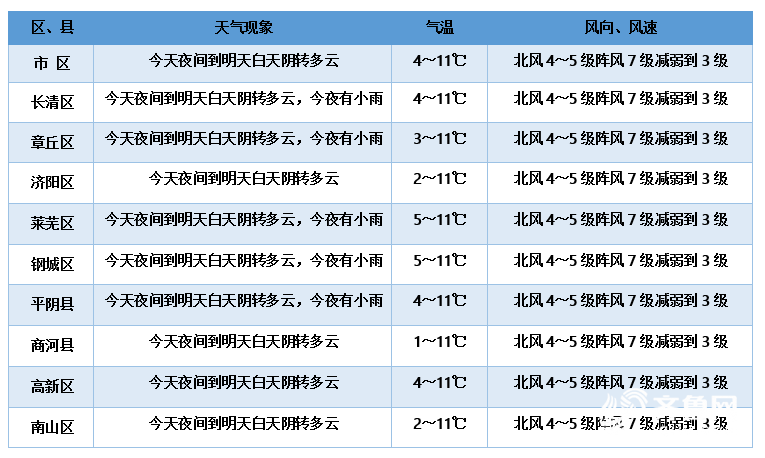 明天夜间到14日晴,南风短时北风3~4级,最低气温济阳区、商河县、南山区-1℃左右,市区及其它区县3℃左右,最高气温15℃左右。