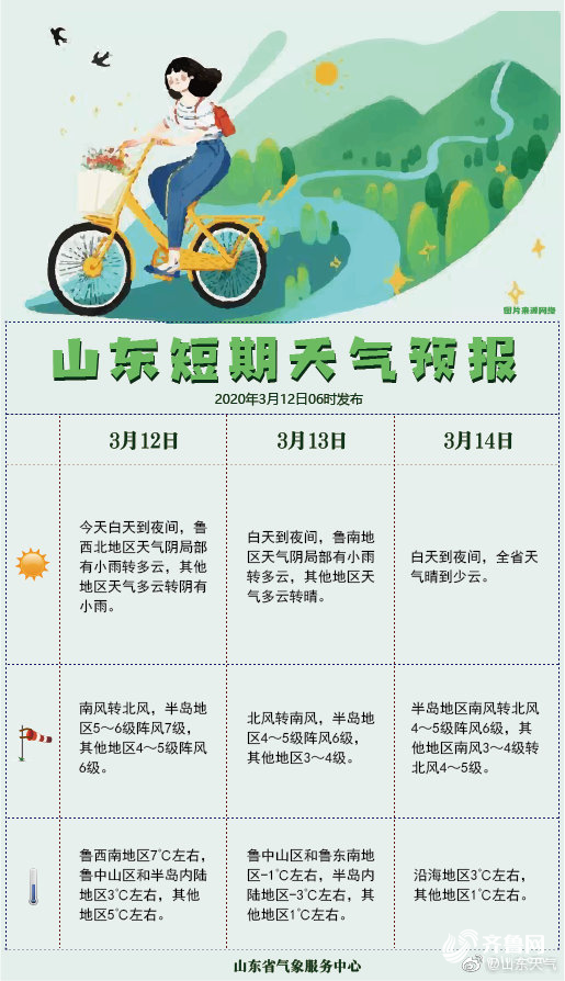 不只是大风,小雨也在路上了,今天夜间到明天白天,鲁中、鲁东南和半岛地区天气,阴有小雨转多云,其他地区天气阴转多云。大部分地区小雨主要集中在今天傍晚到夜间,降水强度较弱。明天白天鲁南部分地区还有小雨。13日夜间到14日白天,全省天气晴到少云,但半岛地区风力仍较大。