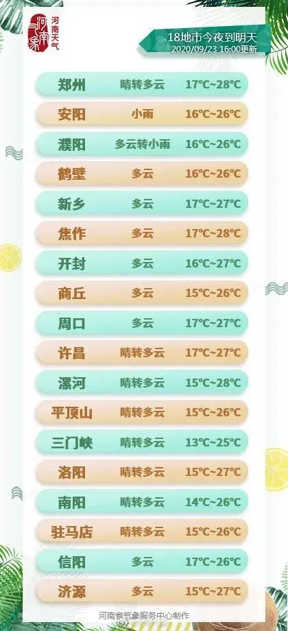 9月30日(星期三):阴天转多云 17-25℃(郑州市气象台)