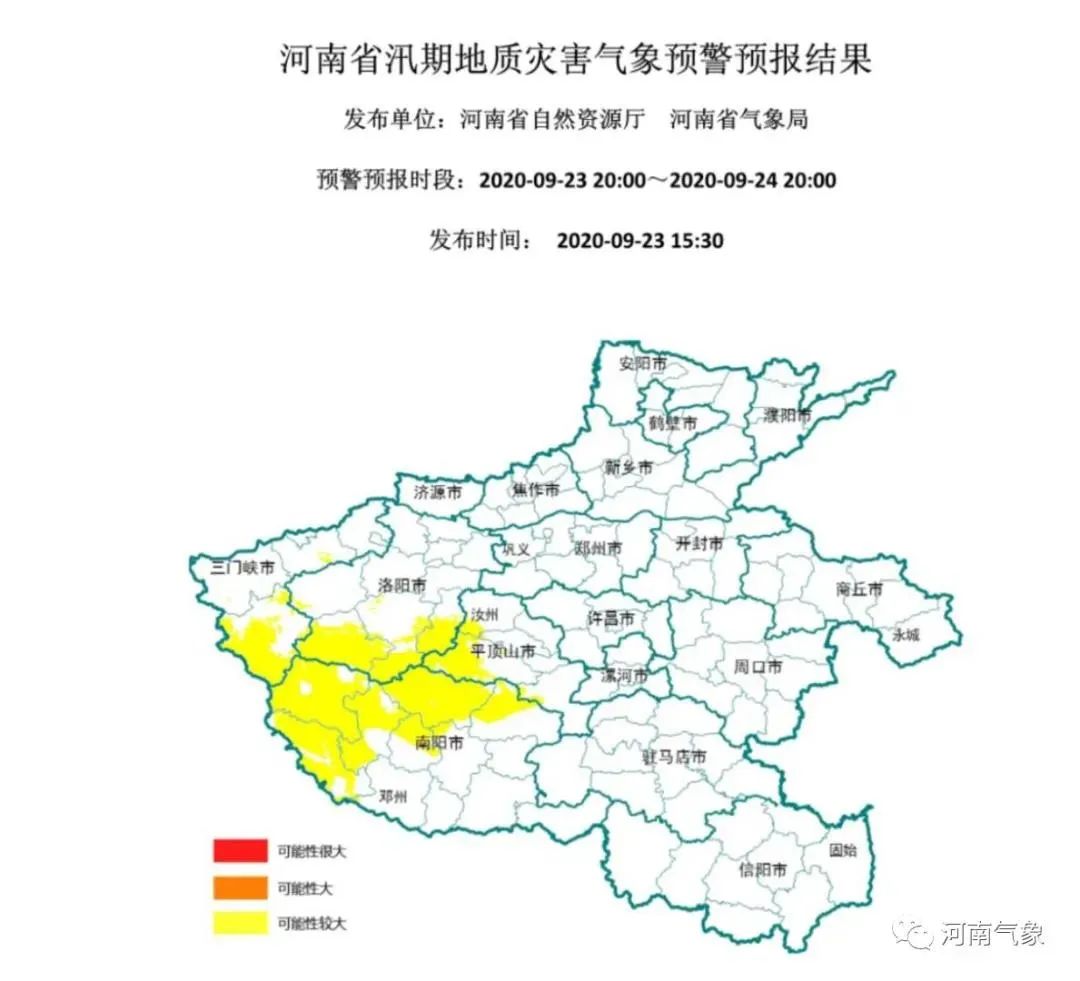 河南省自然资源厅、河南省气象局联合发布:9月23日20时至24日20时,河南省地质灾害预警预报达到黄色预警的地区为:三门峡南部及东部局部, 洛阳南部及西北部,南阳西部及北部,平顶山西部,汝州西南部,发生地质灾害的可能性较大。