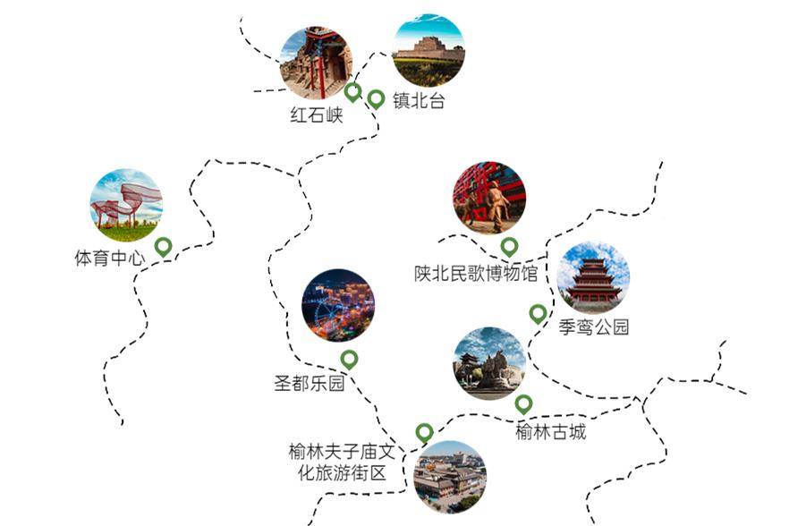 榆林古城→夫子庙文化旅游街区→圣都乐园→季鸾公园→陕北民歌博物馆→红石峡→镇北台→体育中心(会展中心、水上运动中心)