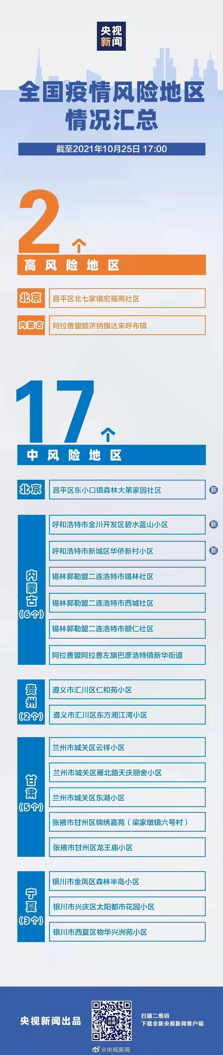截至10月25日19时,新一轮疫情共波及陕西西安市,内蒙古自治区呼和浩特市、阿拉善盟、锡林郭勒盟、鄂尔多斯市,湖南长沙市、株洲市,宁夏吴忠市、银川市,甘肃兰州市、张掖市、嘉峪关市、天水市、陇南市,北京市,贵州遵义市,湖北天门市,青海海东市,河北邢台市、保定市、石家庄市,四川自贡市共11个省(自治区、直辖市)22个市。此外,全国新增3个中风险地区,至此高中风险地区累计为“2+17”。