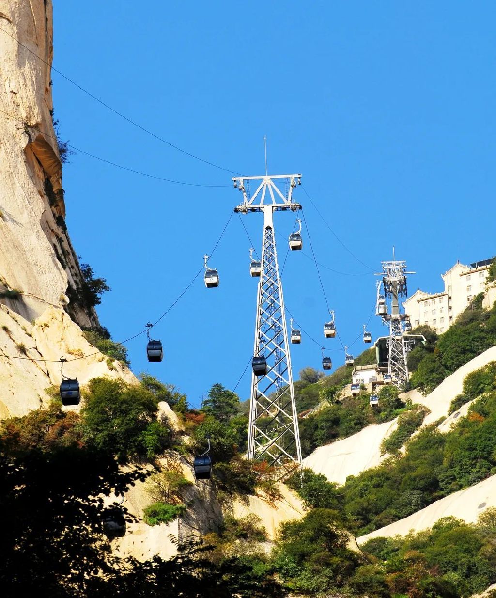华山北峰索道全套设备从奥地利多贝玛亚公司引进,全长1524.9米,落差755米,平均坡度59.2度。索道从山脚沿当年“智取华山”的小道上空飞架,直达北峰,蔚为壮观。