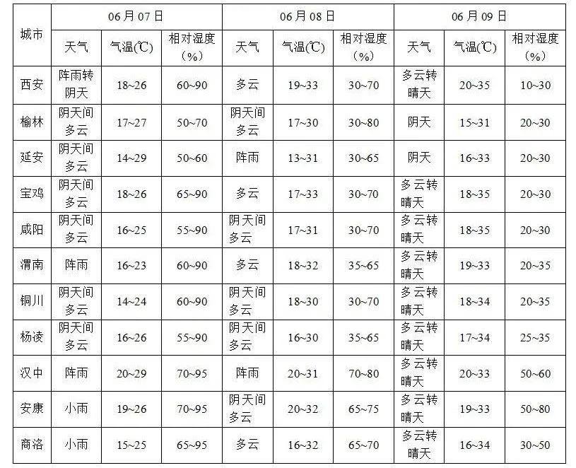 6日:全省阴天间多云,延安南部、关中大部、陕南大部有阵雨或雷阵雨(0-1mm),安康东南部部分地方、秦巴山区局地有中到大雨(10-40mm)。关中东部部分地方日最高气温可达35℃以上。