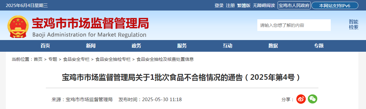 陕西省宝鸡市市场监督管理局关于1批次食品不合格情况的通告(2025年第4号)