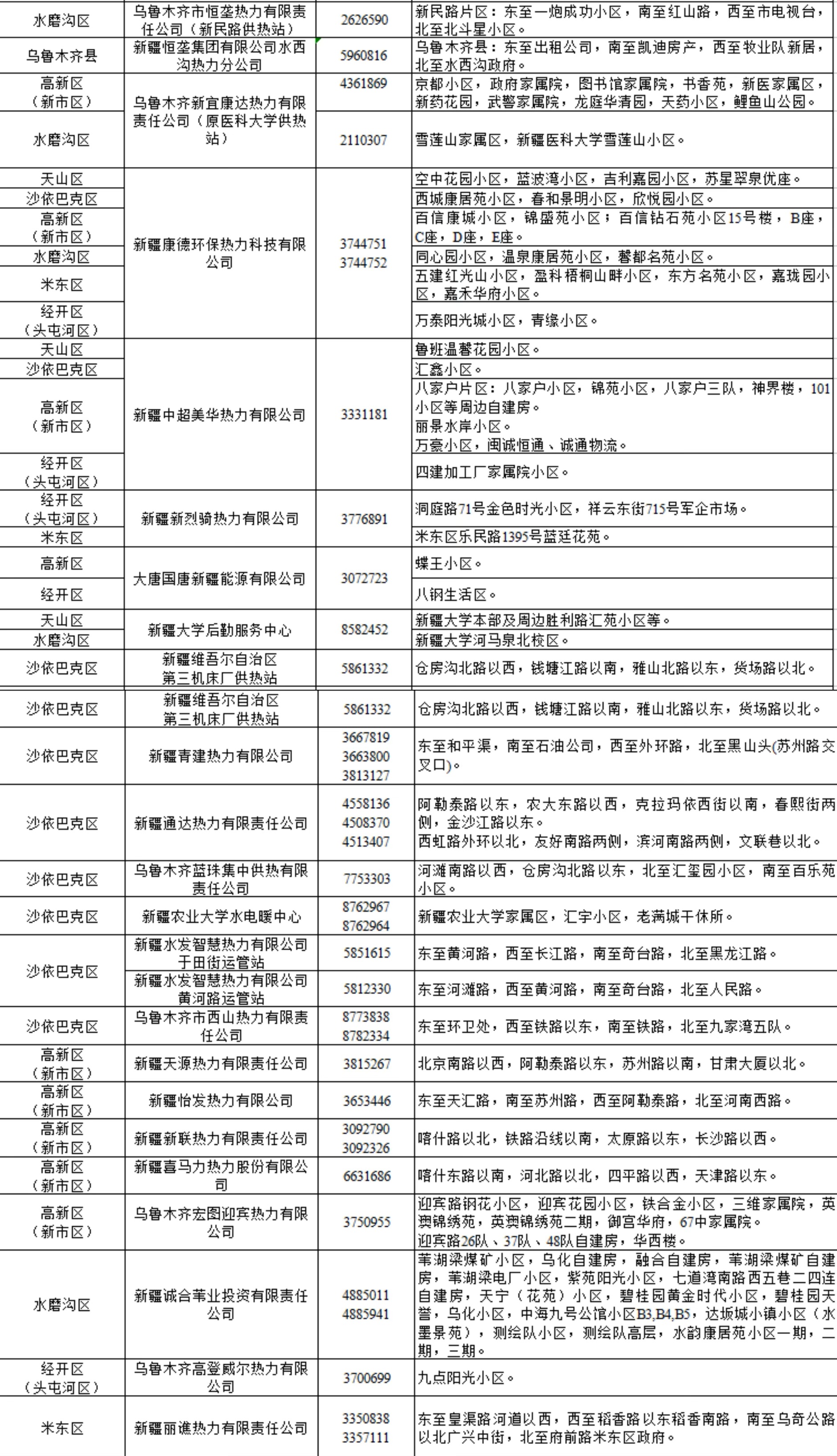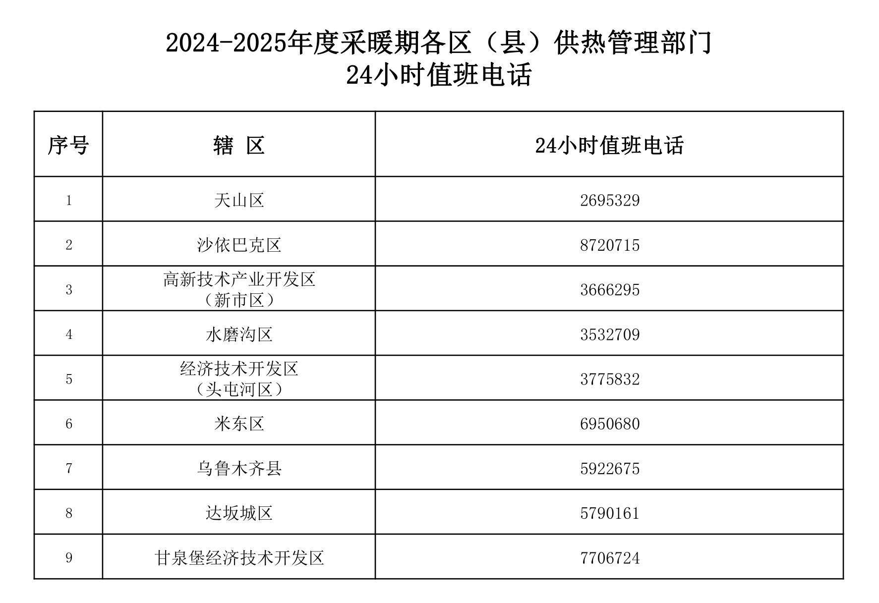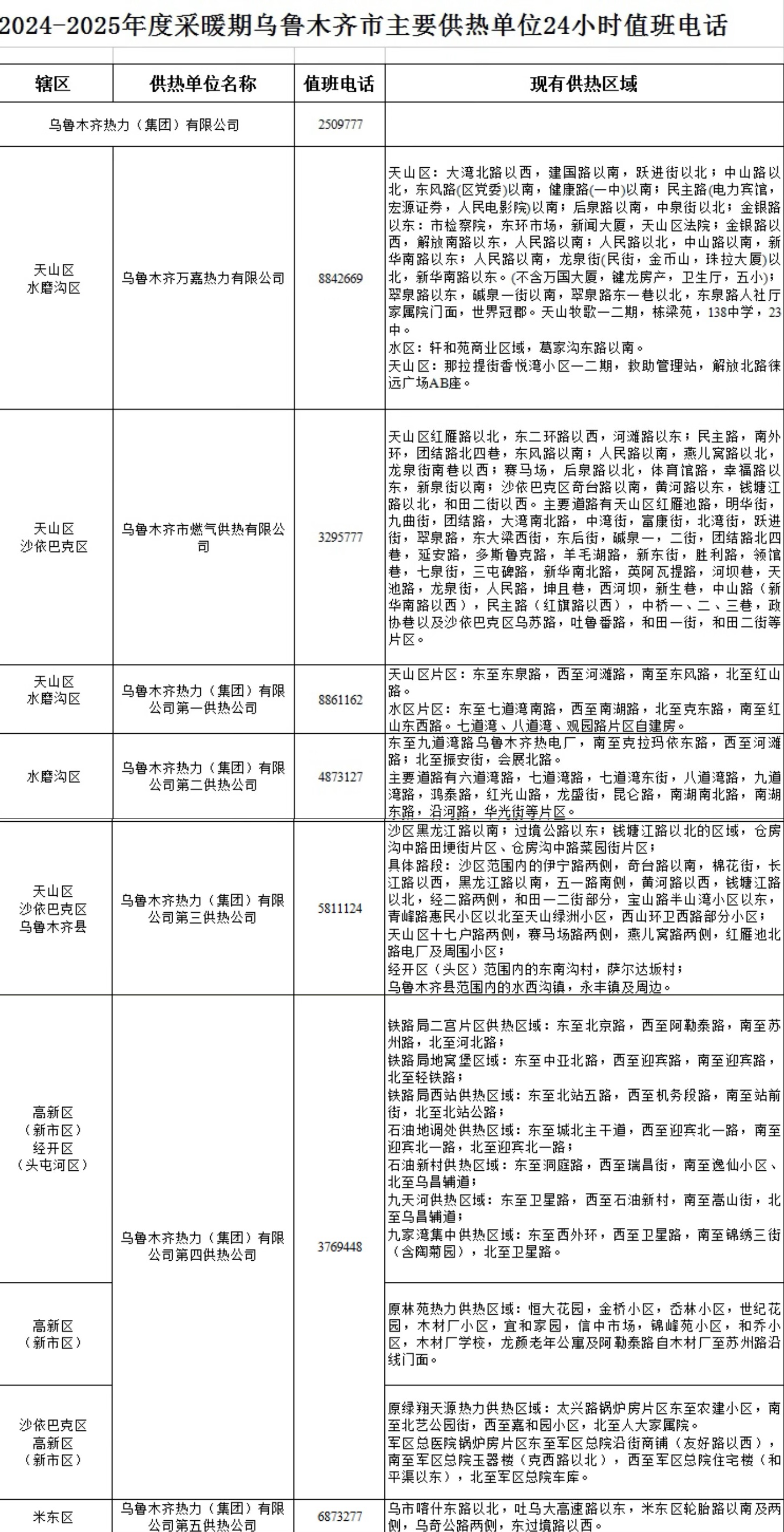 天山网-新疆日报讯(记者叶晓敏报道)乌鲁木齐市2024—2025年度采暖期临近,目前各项供热准备工作已就绪。9月30日,乌鲁木齐市城市管理局(城市管理行政执法局)燃气与供热保障服务中心公布大型供热企业24小时值班热线及各级供热管理部门24小时值班热线,居民遇到供暖问题或需求可拨打服务热线反映。