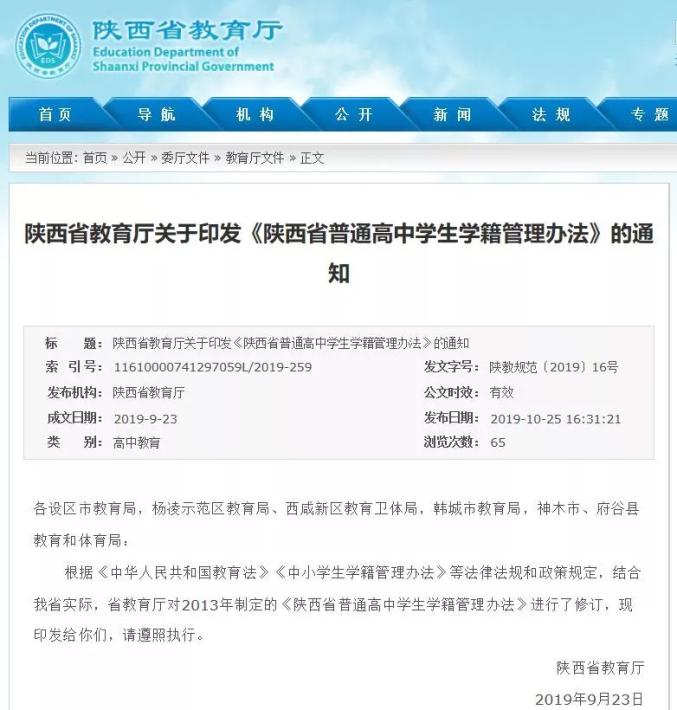 ▪近日,《陕西省普通高中学生学籍管理办法》印发,办法规定:①不为已接收学生建立学籍档案;②以虚假信息建立学籍或学籍档案;③为实际不在本校就读的学生建立学籍;④不及时把学籍变动信息纳入学籍档案;⑤不按规定为学生转接学籍档案;⑥泄露或非法使用学生学籍信息;⑦违反本办法规定的其他行为……等7种行为,情节严重者依法追究学校责任。