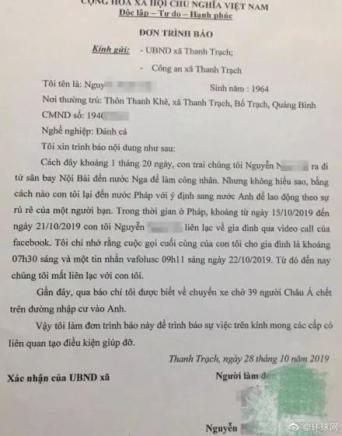 ▪据越南广平省布泽县清泽乡人民委员会29日消息,清泽乡一户家庭向其报案称家人在“前往英国的途中失联”。截至目前,越南已有29户家庭就家人在欧洲失踪向当地人委会报案。