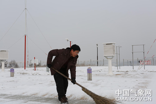 在最近一次的强降雪过程中,工作人员进行观测仪器的维修。于柏奇 摄影
