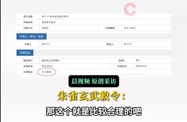 4月25日,该小伙朱先生告诉记者,他得知自己“周天紫微大帝”的改名申请状态变更为“不予受理”。