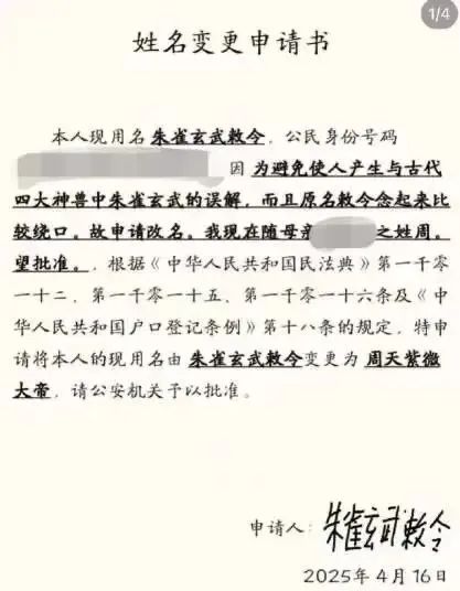 该小伙发帖称,自己现用名为“朱雀玄武敕令”,因该名易引发误解且拗口,申请随母姓,并更名为“周天紫微大帝”,其公布了身份证及姓名变更申请书。