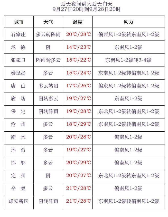 明天夜间到27日,张家口南部和承德、保定、石家庄、邢台、邯郸五个地区的西部多云转阴有分散性阵雨,其他地区多云。