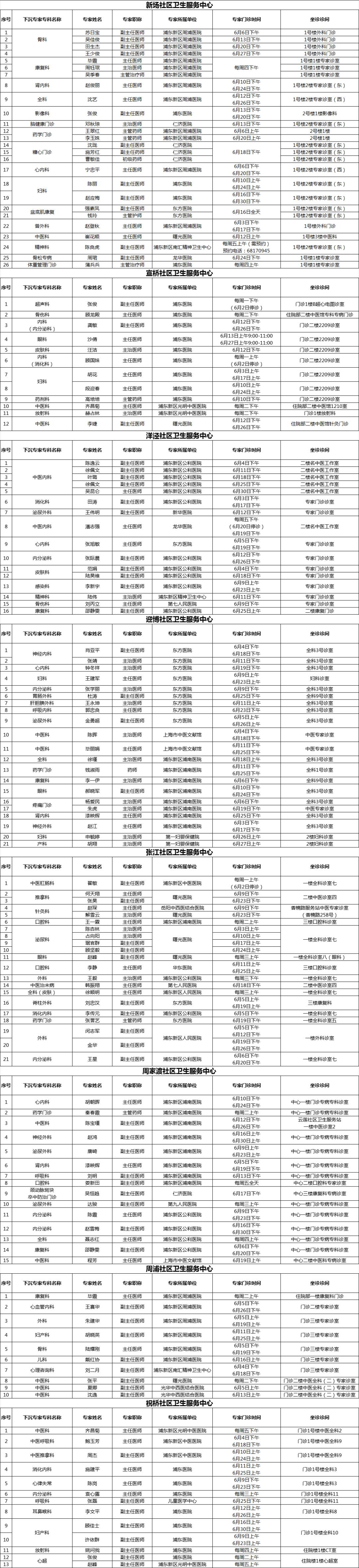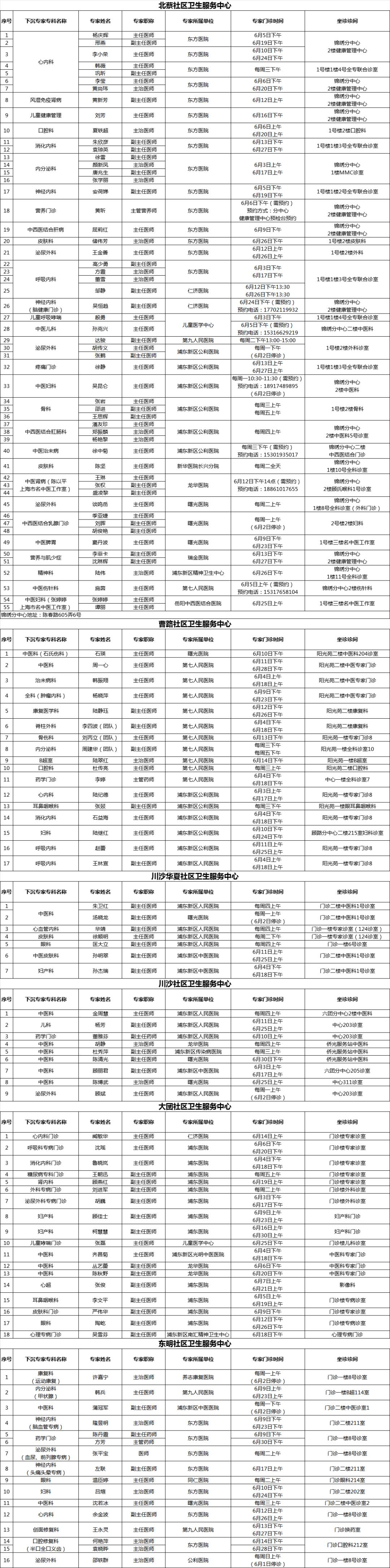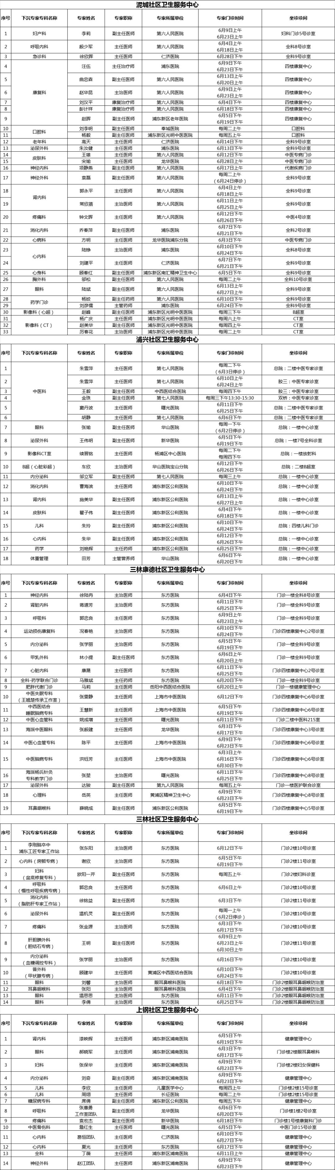 浦东新区持续推进社区卫生服务提质增能,加强分级诊疗。在有关市级医院、区属医院的大力支持下,浦东新区各社区卫生服务中心结合社区实际需求,开设上级医院“专家进社区”门诊,持续为辖区居民提供“家门口”的适宜专科服务。2025年6月专家门诊时间可参见下表: