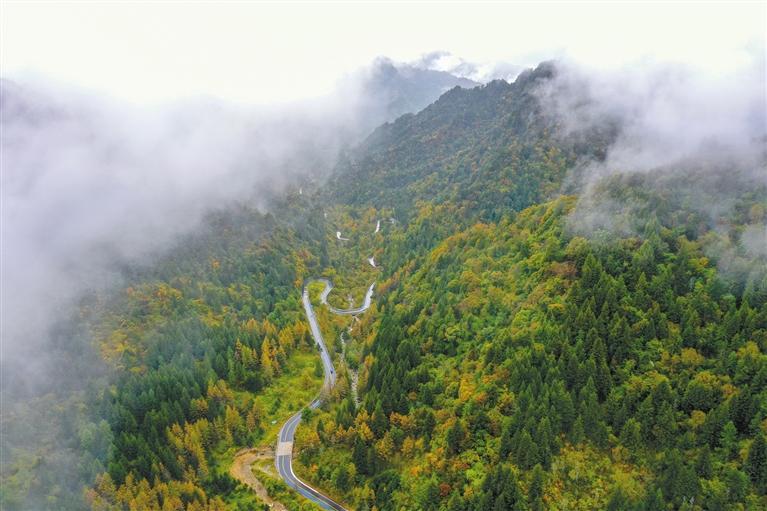 十月二日,位于秦岭南麓的安康市宁陕县平河梁,秋雨绵绵,白色的云海千姿百态,与高山、树木、蜿蜒的公路构成一幅美丽的画卷。(