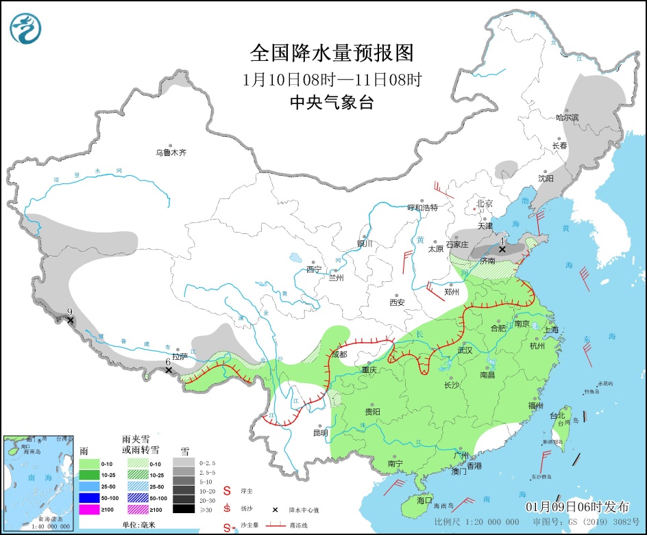 1月10日08时至11日08时,东北地区东部、西藏东部和西南部、河北南部、黄淮中东部等地部分地区有小到中雪或雨夹雪,其中,西藏西南部局地有大雪。河南东部和南部、江淮、江汉大部、江南、西南地区东部、云南东南部、华南大部、台湾岛大部等地部分地区有小雨。内蒙古中部、陕西北部、河南西部等地部分地区有4~5级风(见图2)。