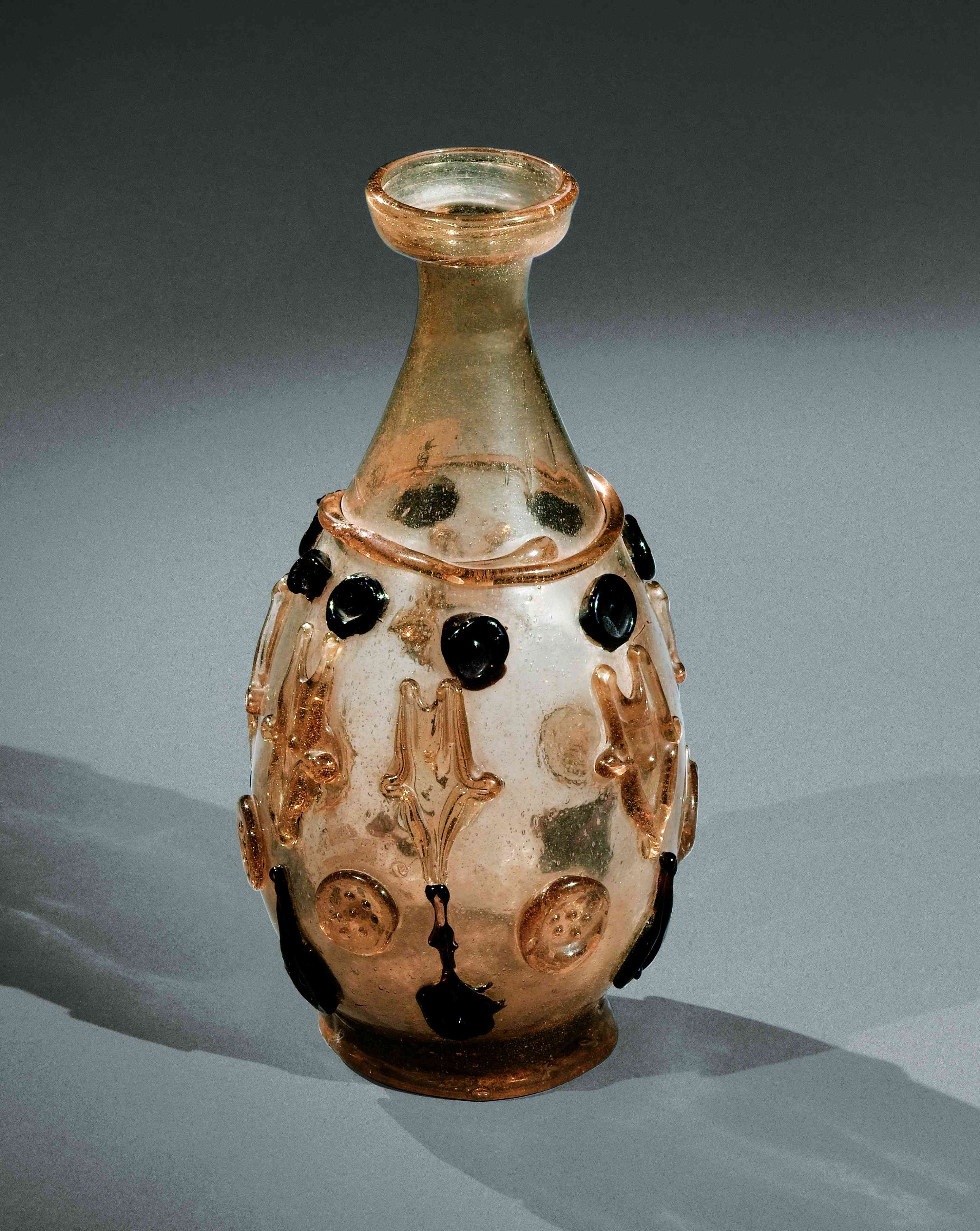 盘口细颈贴塑淡黄色琉璃瓶。