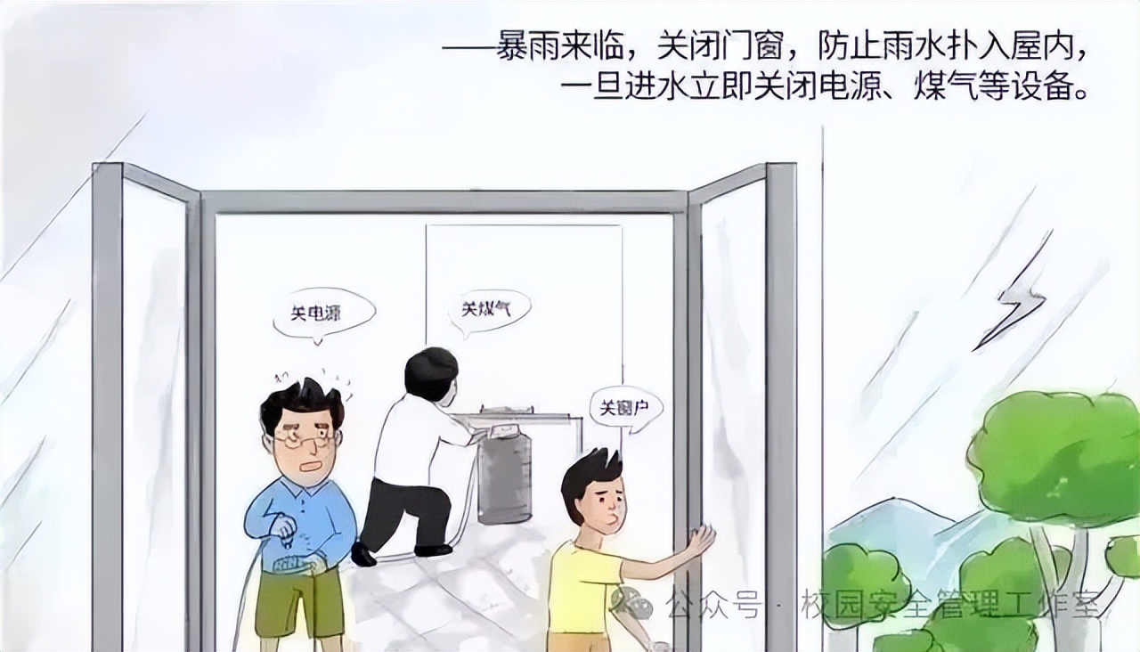 1、暴雨来临,关闭门窗,防止雨水扑入屋内,一旦进水立即关闭电源、煤气等设备。