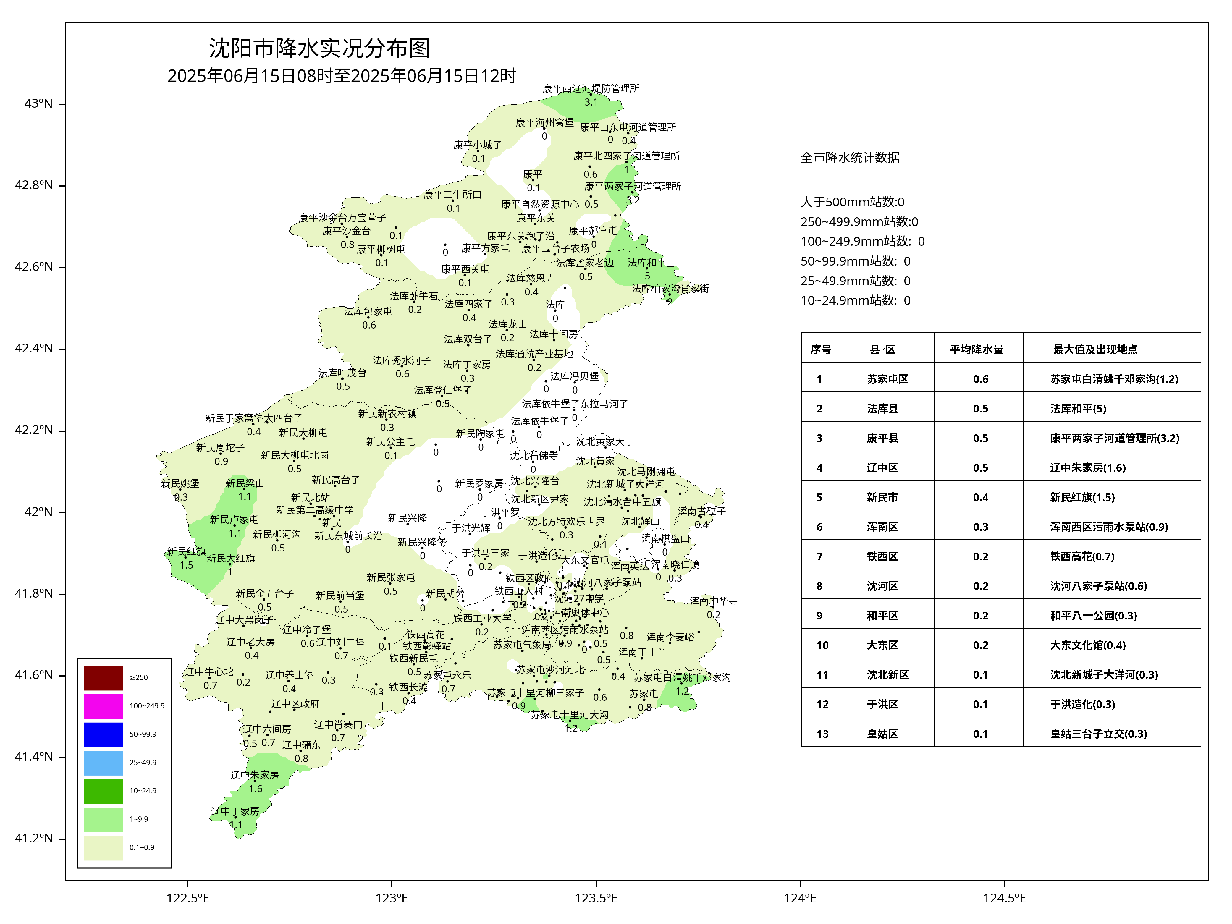 6月15日8时至12时雨情(mm):全地区平均降水量0.3,最大值5(法库和平乡),最大小时降水量4.8(法库和平乡,10时至11时);城区平均降水量0.1,最大值0.7(铁西高花街道),最大小时降水量0.5(铁西高花街道,9时至10时)。
