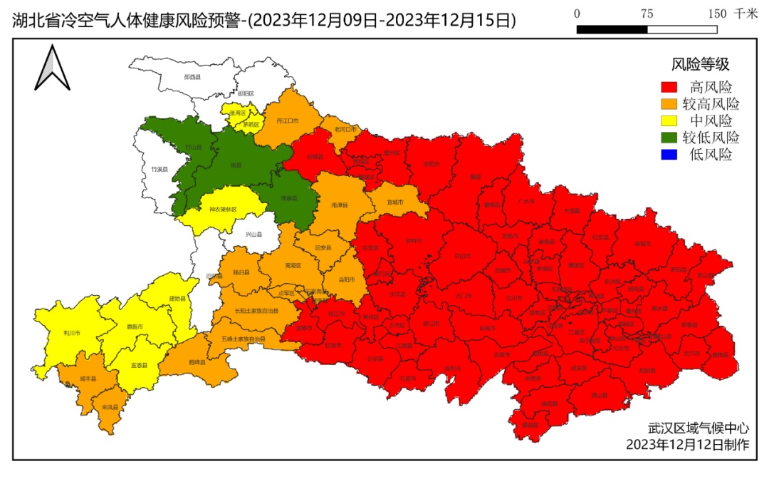 此次冷空气过程降温明显,极易诱发人体呼吸道和心脑血管等疾病的发生。根据监测和模型预报,14—16日我省中东部地区冷空气人体健康风险达较高至高风险等级,尤其是随州、孝感、黄冈、武汉、天门、仙桃、咸宁、鄂州、黄石、荆门、荆州等地区。