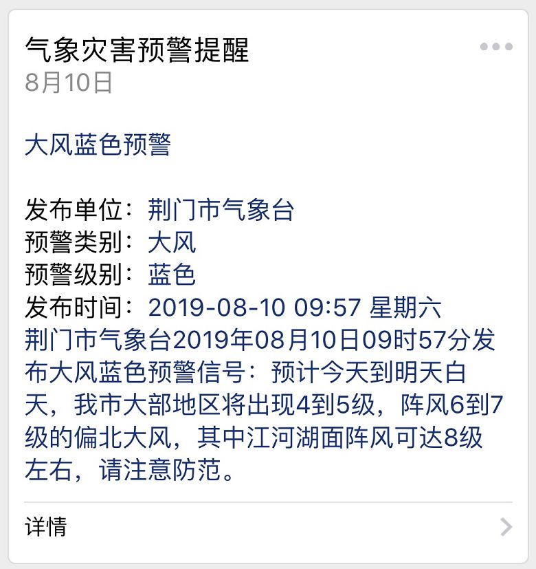 荆门市气象台2019年08月10日09时57分发布大风蓝色预警信号:预计今天到明天白天,我市大部地区将出现4到5级,阵风6到7级的偏北大风,其中江河湖面阵风可达8级左右,请注意防范。